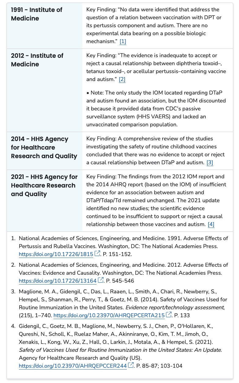 After decades of gaslighting families about autism and vaccines, an evaluation of the data, without scientific or political bias, finds no evidence to support the claim that “vaccines do not cause autism.” A unique feature of the updated CDC webpage is the inclusion of sourced statements. This is unusual for the agency, which is notorious for citing itself, or linking to another CDC page, to justify its claims.