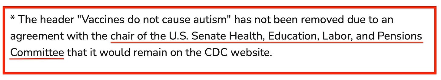 Louisiana’s U.S. Senator Bill Cassidy, chair of the U.S. Senate Health, Education, Labor, and Pensions (HELP) Committee, is the asterisk behind the statement that still remains on the website: Vaccines do not cause autism.* As noted on the CDC website, as HELP chair, Cassidy has exerted political pressure to preserve the statement, even though doing so appears to conflict with federal requirements mandating accuracy and transparency in public health communications.